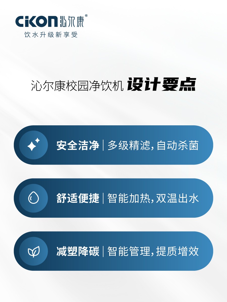 设备兼顾实用性与安全性,采用智能热交换技术,利用凉水对烧开的净水进行物理降温,节电的同时实现开水、温水双出水,并配置卡控出开水功能,方便老师取开水泡茶,学生喝温开水更安全,充分适配师生日常取水需求。此外,所有设备都可以通过沁尔康智饮云平台在线管理,助力学校后勤管理提质增效。